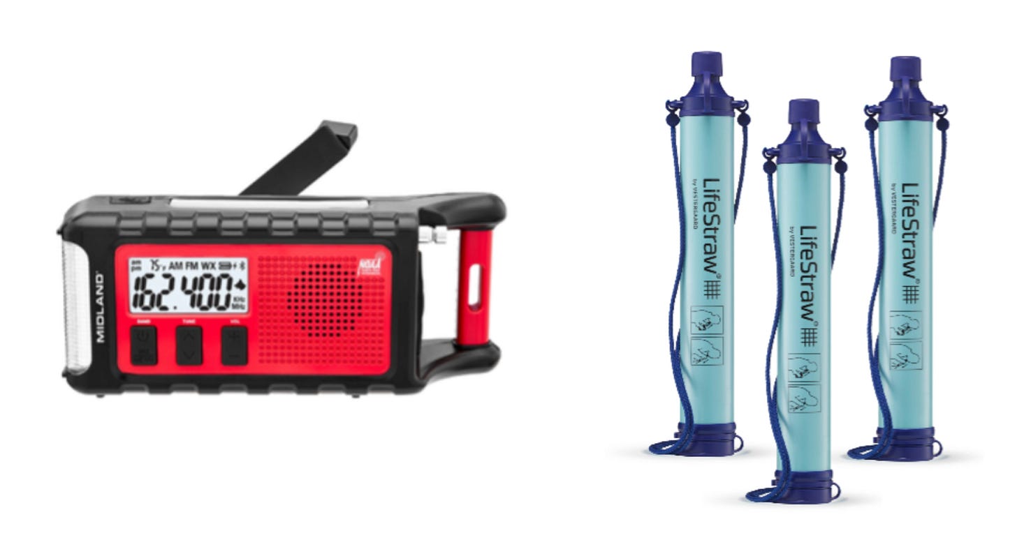 Lastly, the prepper 80/20 essentials: a hand crank radio and LifeStraws