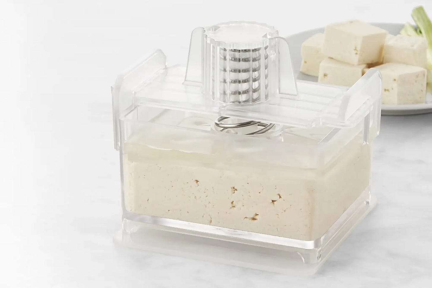 Well pressed tofu is a completely different food than the wet mush that comes straight out of the container. Restaurants mostly get their delicious toothsome tofu by pressing it well. At first I thought the Xpress’ $50 price-tag was excessive, but after trying an alternative that uses elastic bands, or spending many nights propping pans or cans on tofu instead, I think you need the metal spring. In 20-30 minutes this one can reduce the size of tofu by about a third, and even a 5 minute press removes a lot of water.